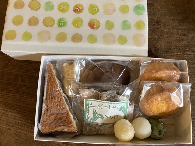 ○「おやつaoi便 12月24日発送」○ ※写真はイメージです。 おやつaoiの発送詰め合わせのご案内です。 月に一度、色んなお味を楽しめるようにこしらえてお届けします。 和菓子なクリスマスプレゼントにいかがでしょう? おうちでの時間がより豊かに過ごせますよう願いも込めて。 (内容) ・シベリア〈日持3日間〉1個 ・888どら焼き〈日持6日間〉1個 ・ネコ最中〈大納言〉〈日持3日間〉1個 ・冬ごもりゆべし〈日持3日間〉1個 ・月餅(パイン餡,黒ごまクルミ餡)〈日持12日間〉各1個 ・季節のお団子/甘夏〈日持1日間〉1本 ・冬のおとずれ/バニラの琥珀糖〈日持8日間〉3個入り *お日持ちは発送日を含めての日持ちです。 ○お届けについて○ クロネコヤマト便で発送致します。 12月24日(水) 発送となりますので、12月25日(木)に必ず受け取りが可能な方でお願い致します。一部天候により遅延がある可能性もございます。ご了承の上ご注文をお願いいたします。 (注意:お日持ちの短いお菓子も含まれています。) 受け取り時間のご希望はヤマトの規定よりお選びください。 今回はお一人様1箱までのご注文とさせていただきます。 お手提袋や代筆メッセージのご希望の方は備考欄にてご記入ください。 ○返品交換について 注文確定後、お客様のご都合による返品・交換は受け付けいたしかねますのでご了承くださいませ。 商品到着後、万が一商品不良がありましたら、問合せフォームよりご連絡いただけますようお願い申し上げます。 ○その他○ その他ご質問などございましたら、問合せフォームよりメールでご連絡くださいませ。2日間以内にメールにてお返事させていただきます。